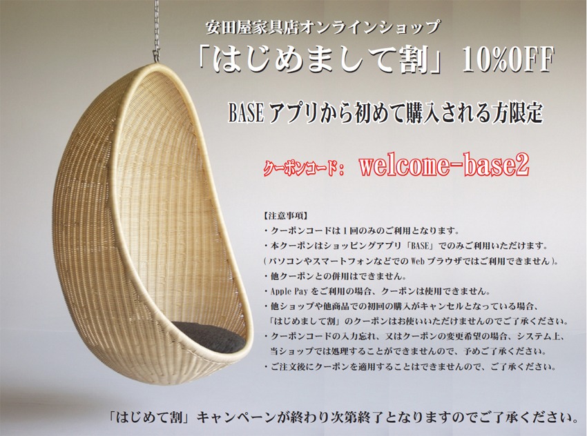 ハンギングEggチェア以外にも桐衣装収納チェストやトランク型チェスト、座椅子など商品単価1,000円以上であれば『はじめて割り 10%OFF』が使用できます。