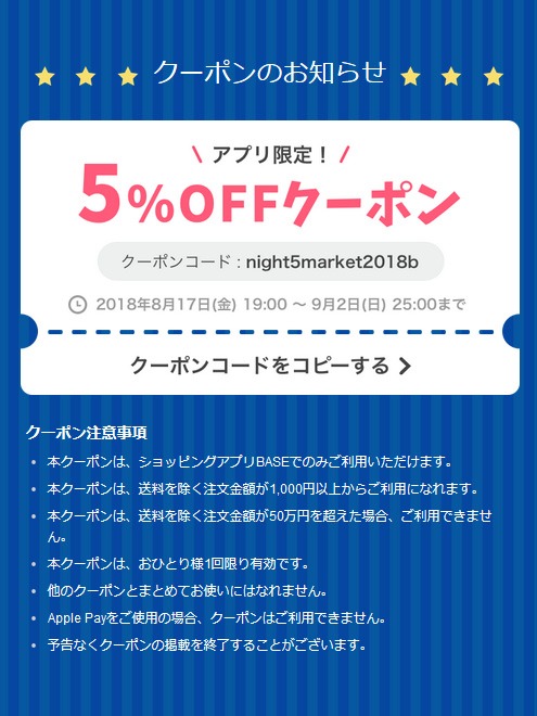 さらにその日から使えるBASEアプリユーザーにお得な「アプリ限定 お買い物クーポン」も発行されます。