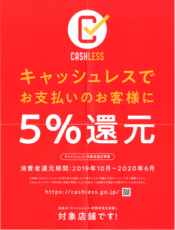 オンラインショップでご注文いただき、クレジットカード支払での決済を行われましても、「キャッシュレス消費者還元事業」の適用外となりますので、還元はございません。あらかじめご了承賜りますようお願い申し上げます。