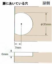 アングル丁番をはずした後の扉板の穴を確認してください。アングル丁番金具のカップの直径は35mmです。穴の長さは26mmです。